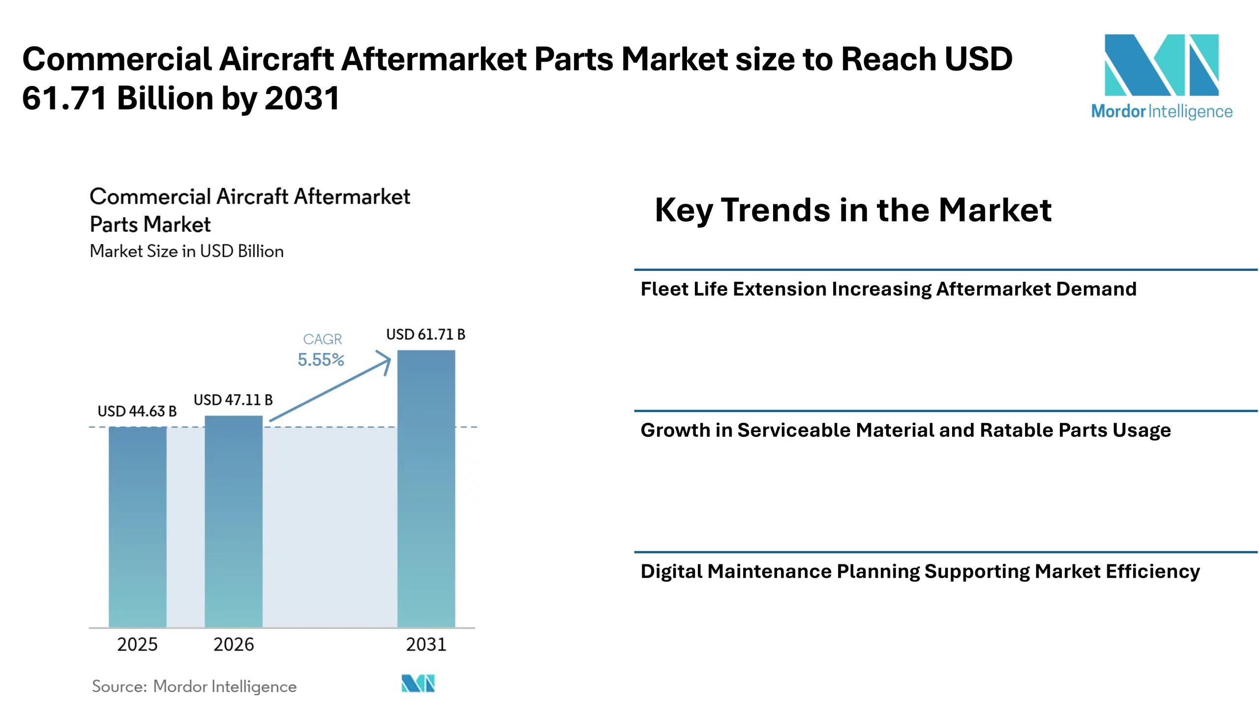 According to Mordor Intelligence, the commercial aircraft aftermarket parts market size is expected to increase from USD 44.63 billion in 2025 to USD 47.11 billion in 2026, with the commercial aircraft aftermarket parts market forecast indicating it will reach USD 61.71 billion by 2031. This steady rise reflects a consistent need for replacement parts, maintenance services, and lifecycle support across global airline fleets.